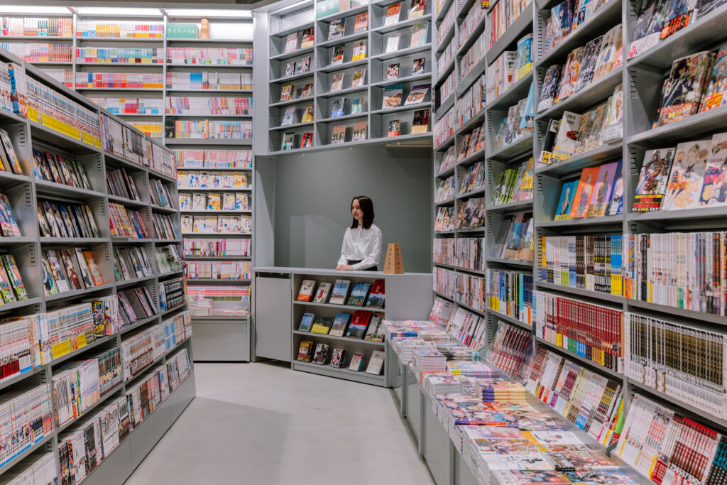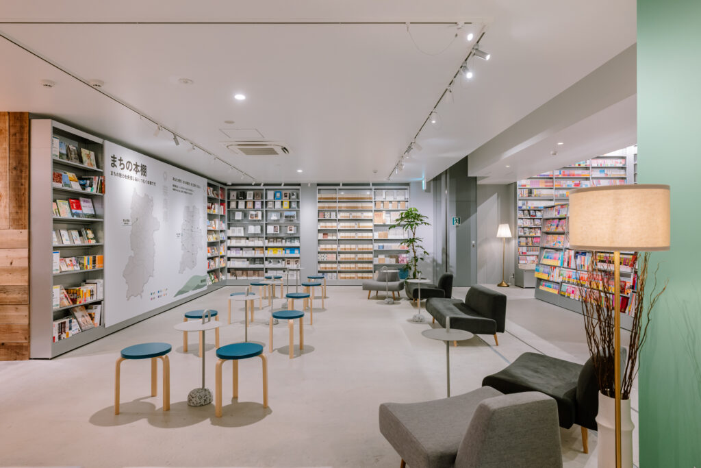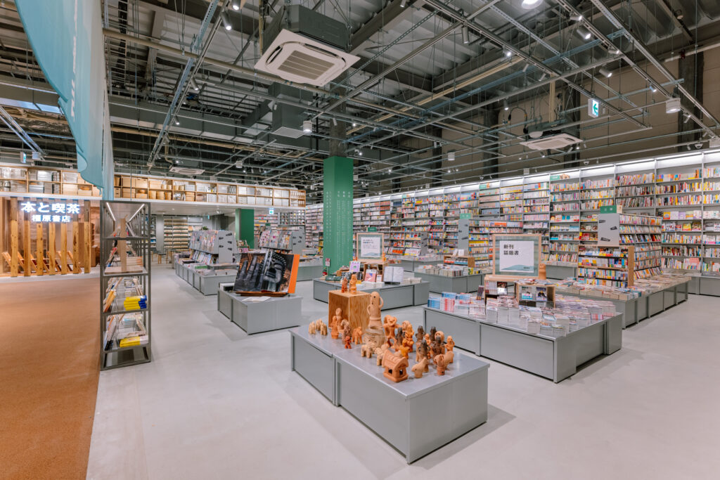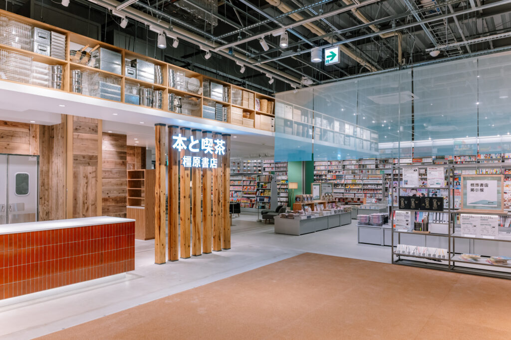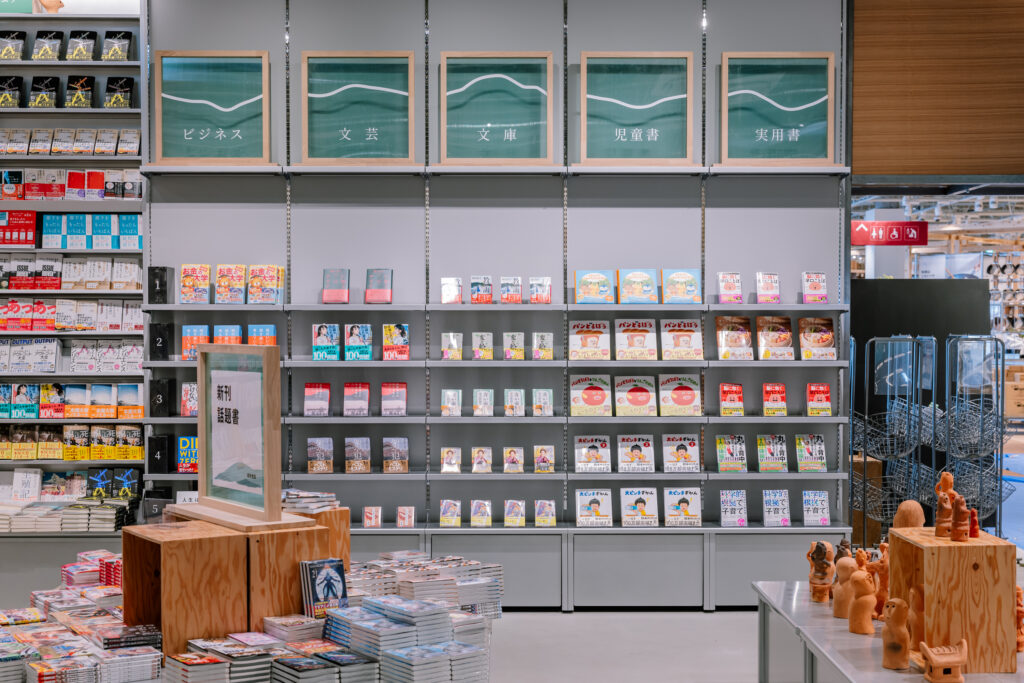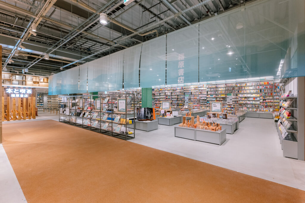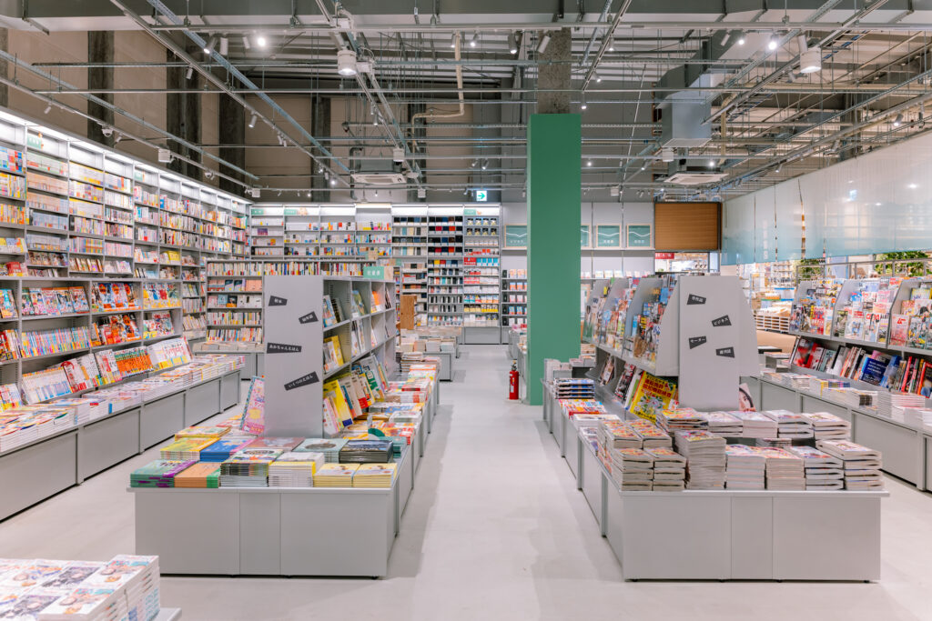 将来的な展開を見据えたプロトタイプとして、圧倒的な蔵書量を印象づける棚構成を採用。サインシステムのキーカラーには橿原を象徴する緑を採用しており、今後各地への展開においてもその土地固有の色を纏うことで、どこに出店しても「その場所らしさ」を帯びた書店として機能する拡張性を備えたデザインとした。