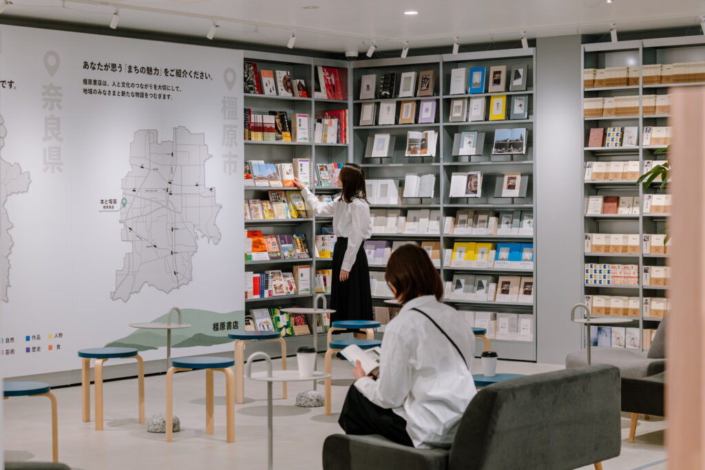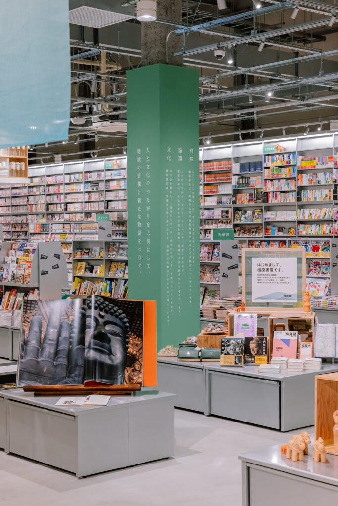 日本出版販売が全国書店との共創モデル第一号店として計画した「橿原書店」。無印良品の店舗内、売り場面積2,484坪に展開するこの書店は、施設が掲げる「自然・循環・文化」の理念を軸に、地域の生産者・住民・文化をつなぐコミュニティとしての新しい書店像を追求した。