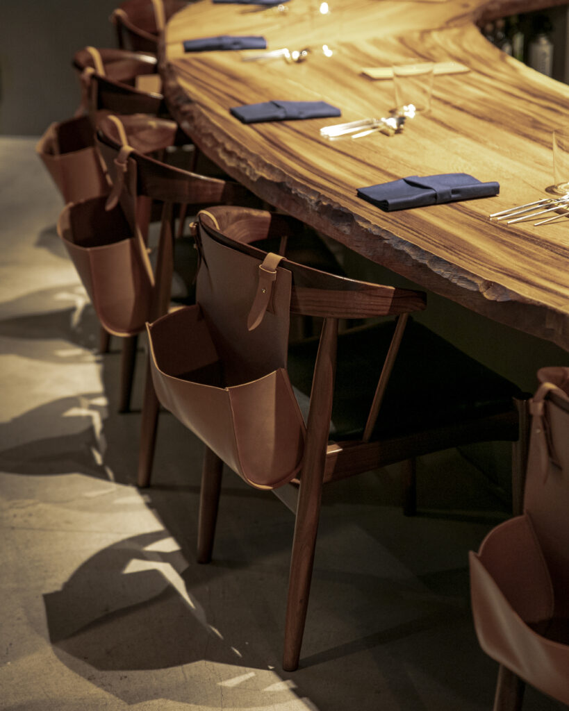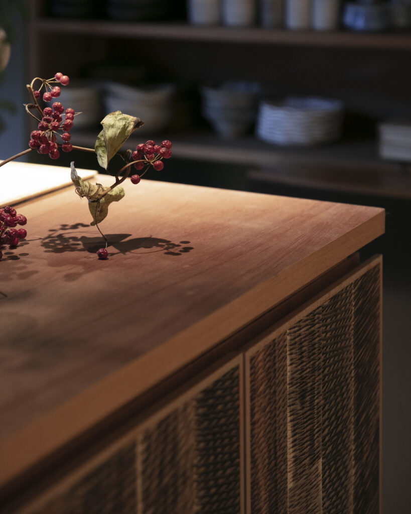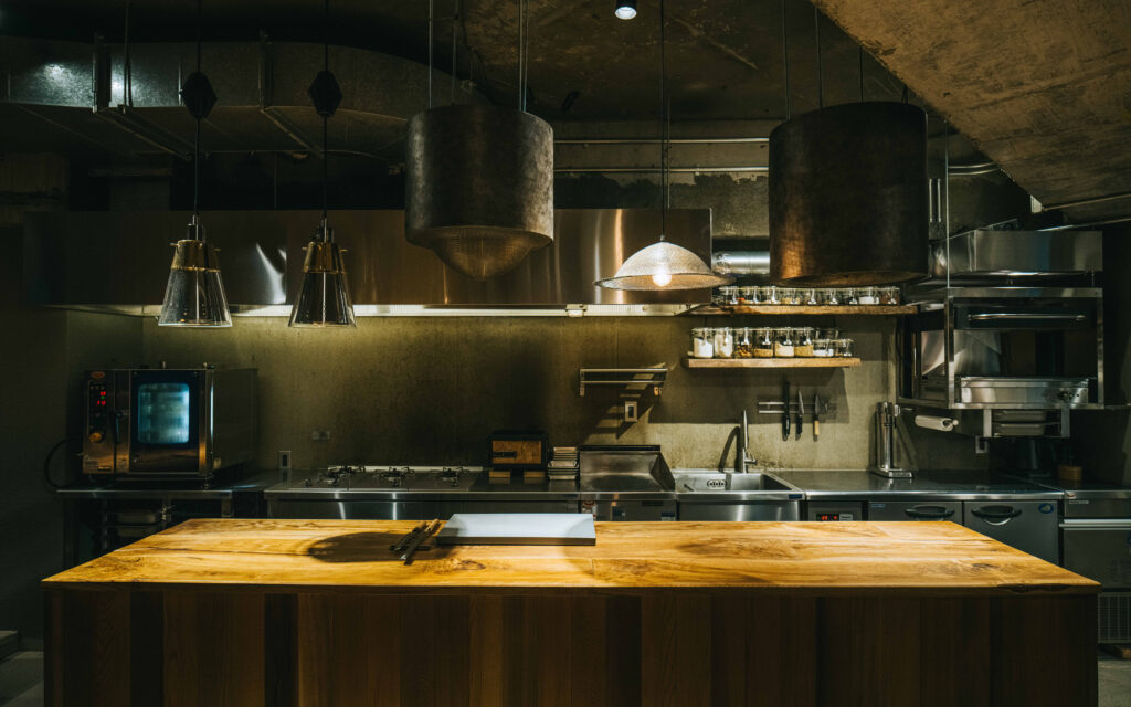 シェフの所作を”舞台”として際立てるべく、「音(聴覚)」を空間デザインに取り入れた。楽曲制作や音源のサンプリングなどの活動を個人で手がけるkm:さんが、体の動きに反応する音響システムの設計・製作と音源制作を担当。BGMには生産者・猟師・陶芸家の作業現場の環境音や、シェフ自身の仕込み音・日常の音を録音し、その一音一音をすべて音楽へと昇華させている。